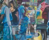 My paintings have always been involved with people in urban spaces, in particular, New York City, but in different ways. I wander the city searching out a scene or event that captures my imagination, with the intent to put it into my own visual language.Reflections, and motion when caught with a camera, create transparencies and multiple layers that become the building blocks from which many of my paintings are constructed. The layers are woven together, creating patterns that become ways of seeing the immediate world in front of us, the world behind us, and multiple views in between. The reflected reality is often visually indistinguishable from the physical reality, the two blending together in a flattened and collage-like way. Also, as we sip our wine and experience a certain self-satisfaction with our lives, troubles out there in the larger world haunt us. Intrusive thoughts, of terrorist acts, bombed-out buildings, random violence, the after-effects of war, come into our mind and become part of our reality; they make up fragmented narratives, dreamlike in their surface dissonance. I have attempted to make visible the intertwining of our immediate pleasures with our inner thoughts.